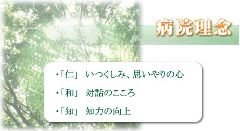 わたしたちは「医は仁術なり」という故事の考えに立ち、患者様に対して、いつくしみの心や思いやりの心をもって、患者様本位の医療に専念していきます。